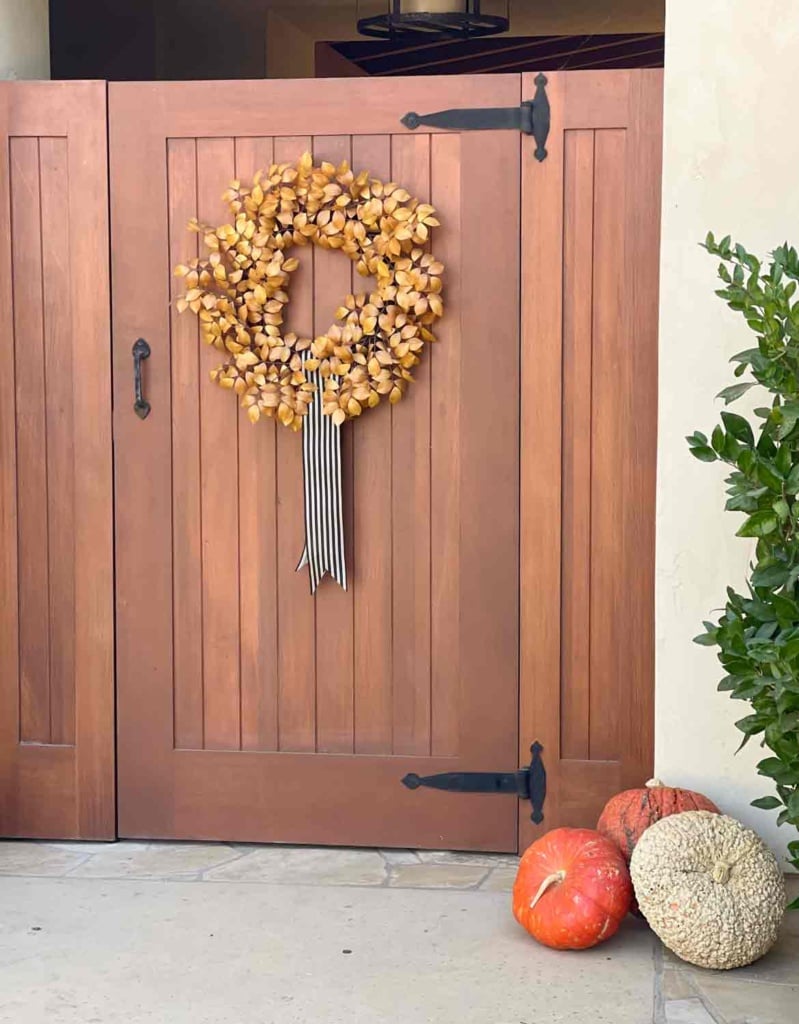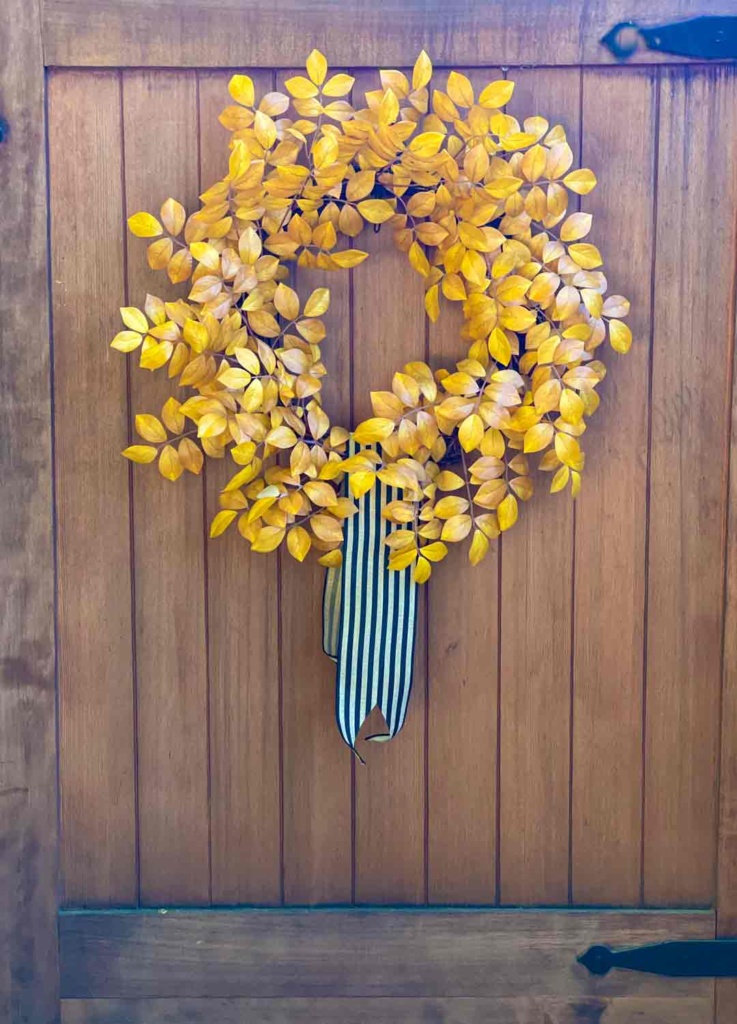 I’m going to head out to my front gate, where my old wreath is hanging, and try out some ribbon. That beautiful golden leaf wreath from Target is sold out near me.