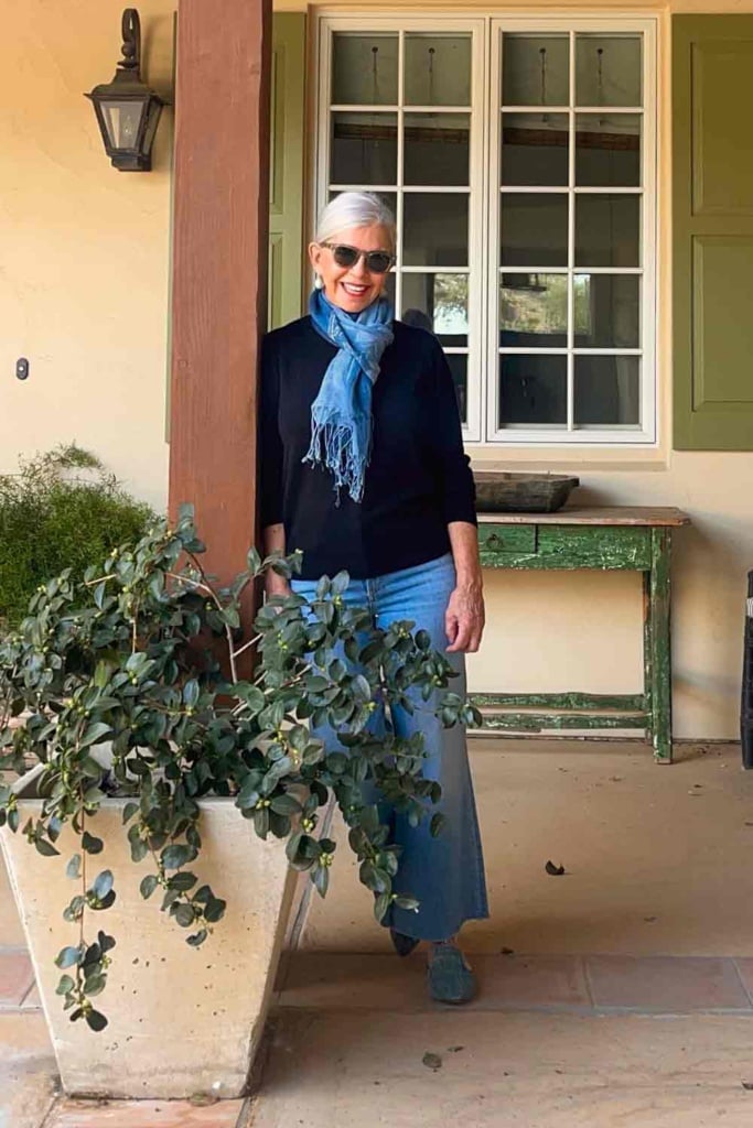 I am wearing the Quince cashmere crew in size medium with my favorite Frank and Eileen jeans, vintage indigo mules and a scarf from Etsy.