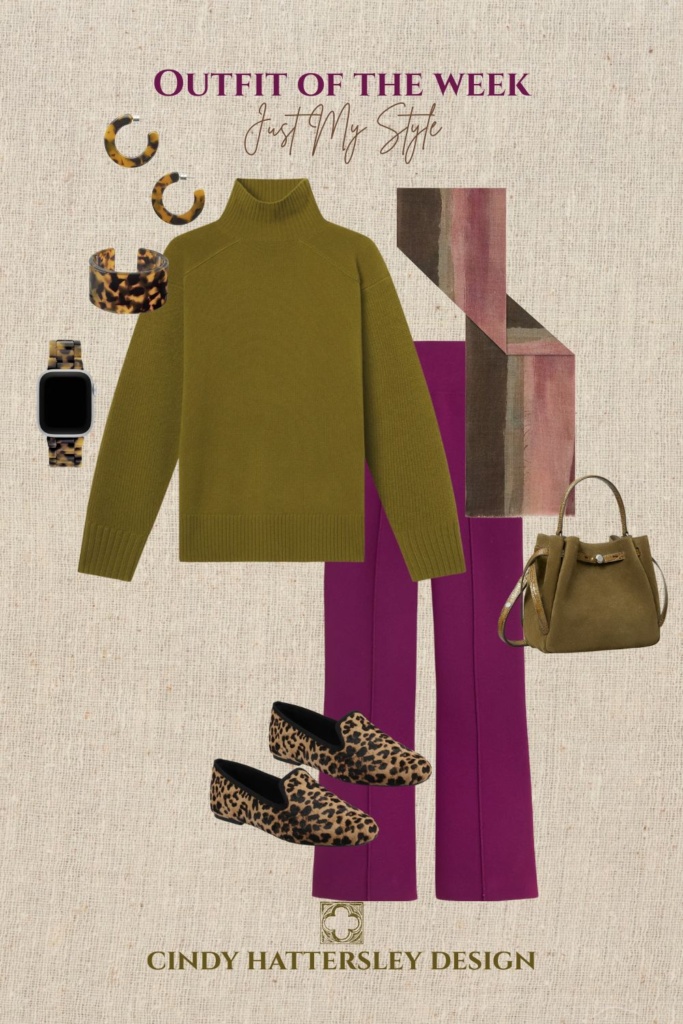 Confession: I am utterly and completely obsessed with this eggplant/olive color combination. While I know it might not appeal to everyone, this year I’ve been inspired to step out of my comfort zone and embrace new hues and patterns in my wardrobe. This is why I always advocate investing in the best core pieces you can afford, and then injecting high-impact interest with accessories. They make experimentation not so scary!