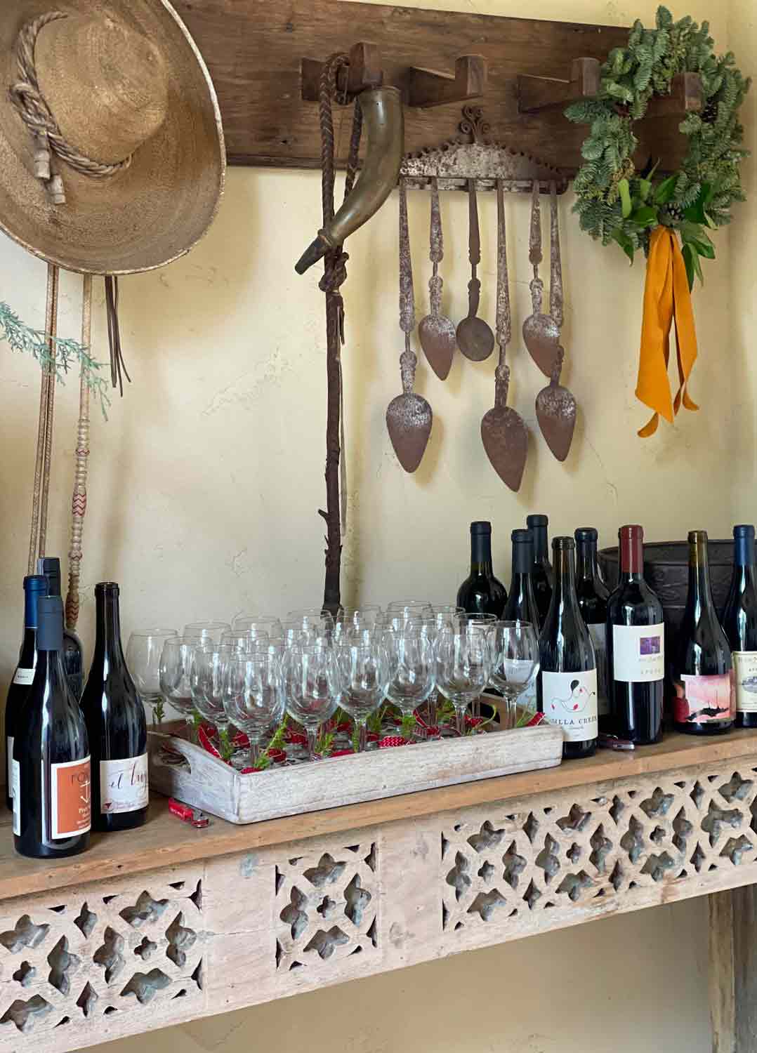 I once covered our pool table with burlap and arranged all of my vintage wicker covered bottles with simple olive branches. People still comment on that tablescape.