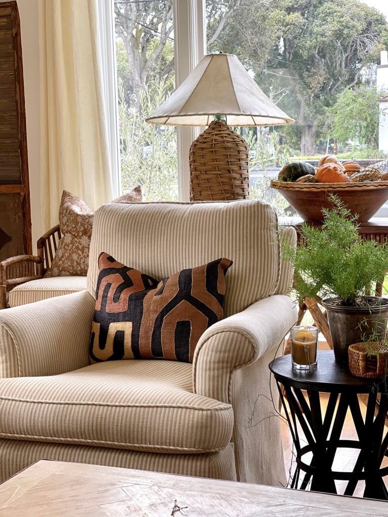 Most of the lamps in my home led a former life as something else. The lamp in one of the guest bedrooms in our former home was a repurposed newel post. We added a mica shade. The lamp base in our primary bedroom is from an old porch railing. The shade is from Ballard. The lamp in our fixer upper living room is a repurposed wicker covered bottle with a hide shade.