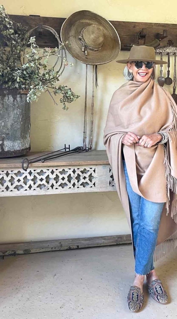 Grab your cashmere throw and repurpose it. I am wearing my Quince cashmere throw with a favorite pair of Artemis Design Co slippers and a favorite hat.