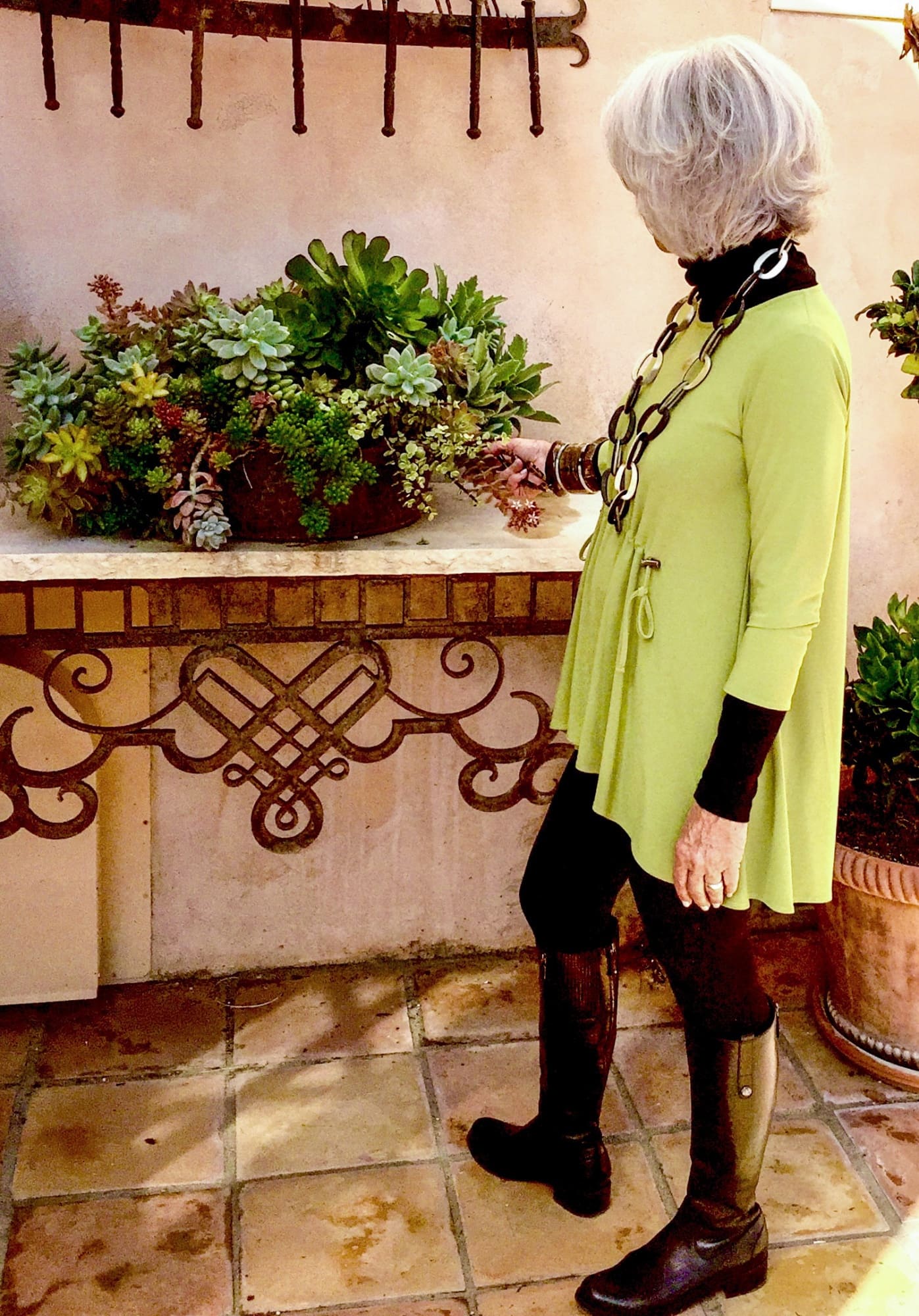 Before I let my hair go grey this shade of green was one of my favs. Initially I felt it caused my hair to take on that dreaded green tinge but now that I have my products down I am starting to wear it again. You can read my post about How to Keep your Gray Hair Looking Great for those tips. The Bailey Tunic from Comfy USA for Artful Home (shown below in black) is super flattering.