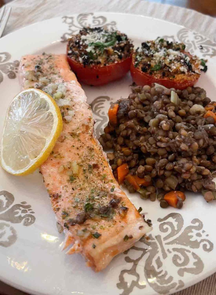 The main course was ,salmon with pesto sour cream sauce, delicious lentils de puy,( maybe Wren will chime in with the recipe,I couldn’t find it) this lentil cucumber salad sounds delicious as well. and yummy tomatoes provencal.